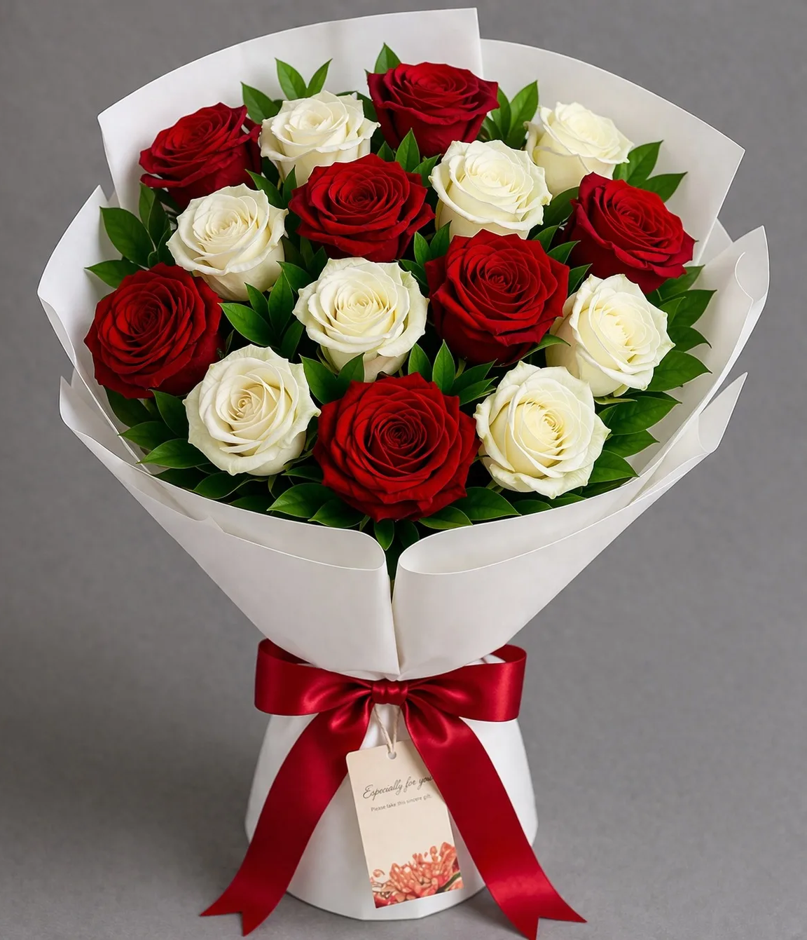 Элегантное сочетание красных и белых роз, дополненное зеленью рускуса, создаёт гармоничную композицию с выразительным контрастом и свежестью.
