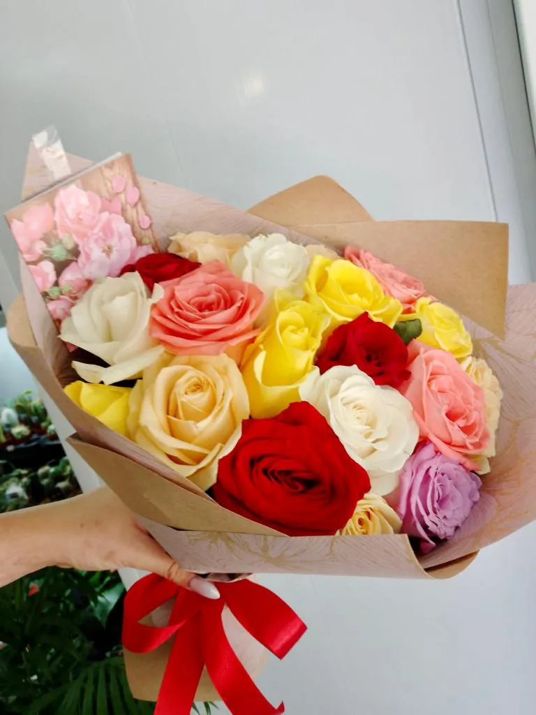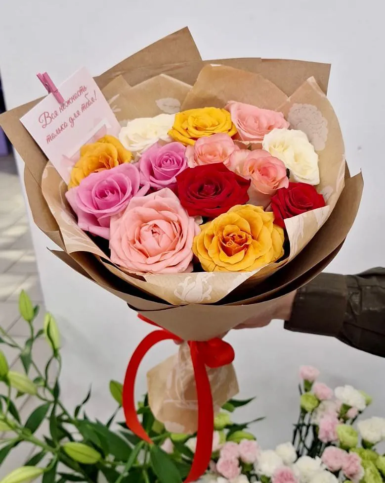 В мире не существует вещей ярче и веселее, чем букет из роз нескольких цветов. Невероятно нежный и в тоже время яркий букет из разноцветных роз. Отличный подарок к празднику для любимой или знакомой вам молодой девушки.