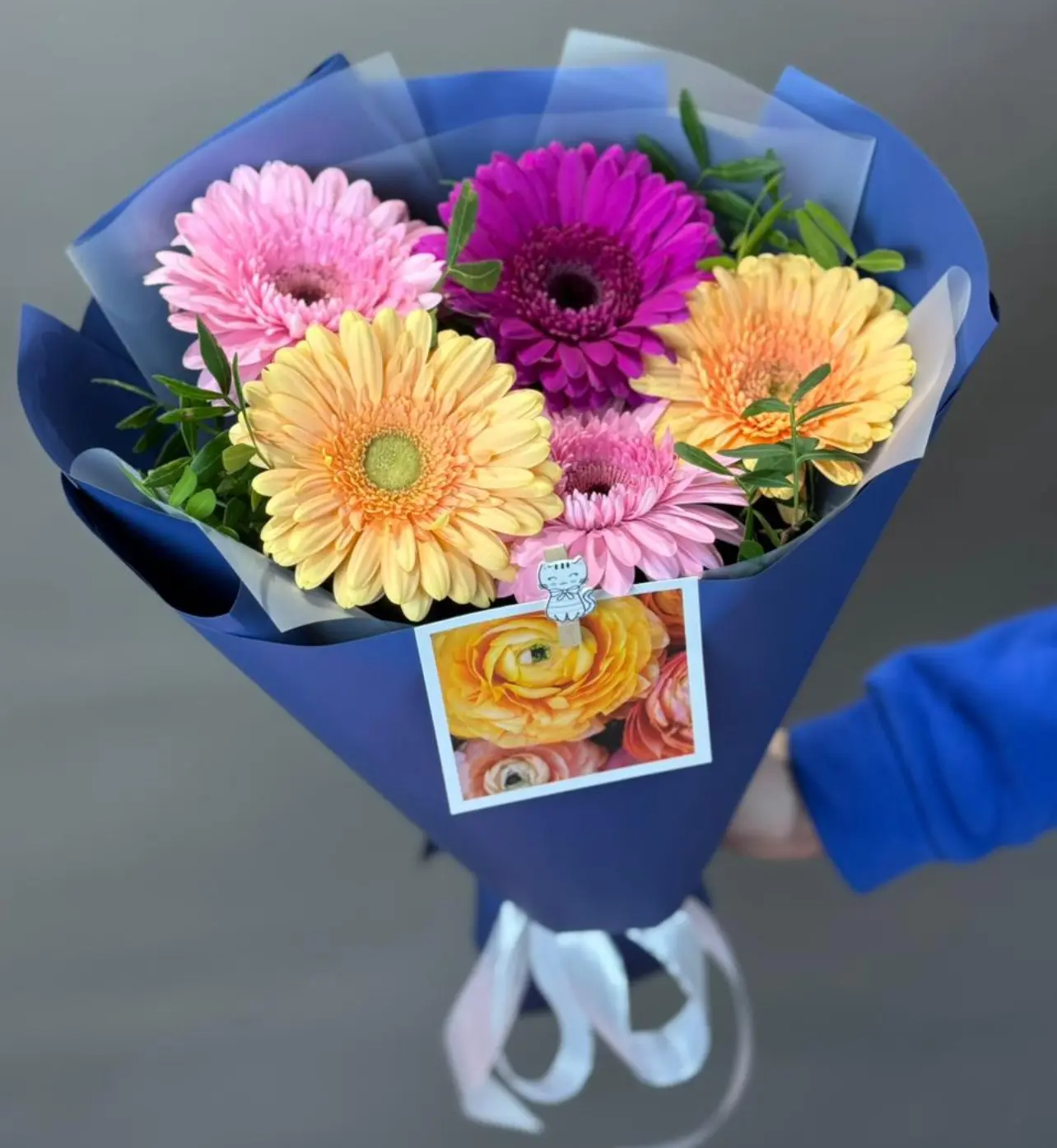 Яркий и жизнерадостный букет из пяти разноцветных гербер, дополненных свежей зеленью, создаёт лёгкое и позитивное настроение. Сочные оттенки цветов гармонично сочетаются с насыщенной синей упаковкой, придавая композиции выразительность и современный стиль.