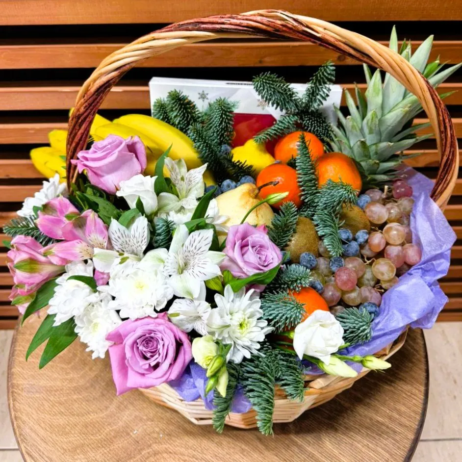 Виноград,бананы,груши ,мандарины,ананас,киви,конфеты цветы |