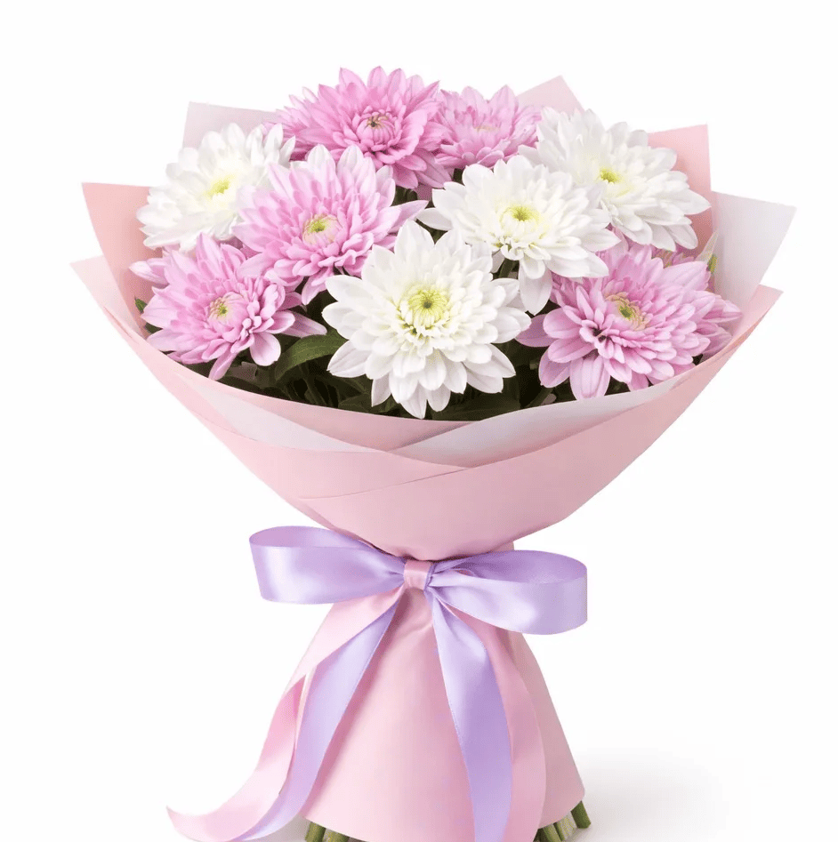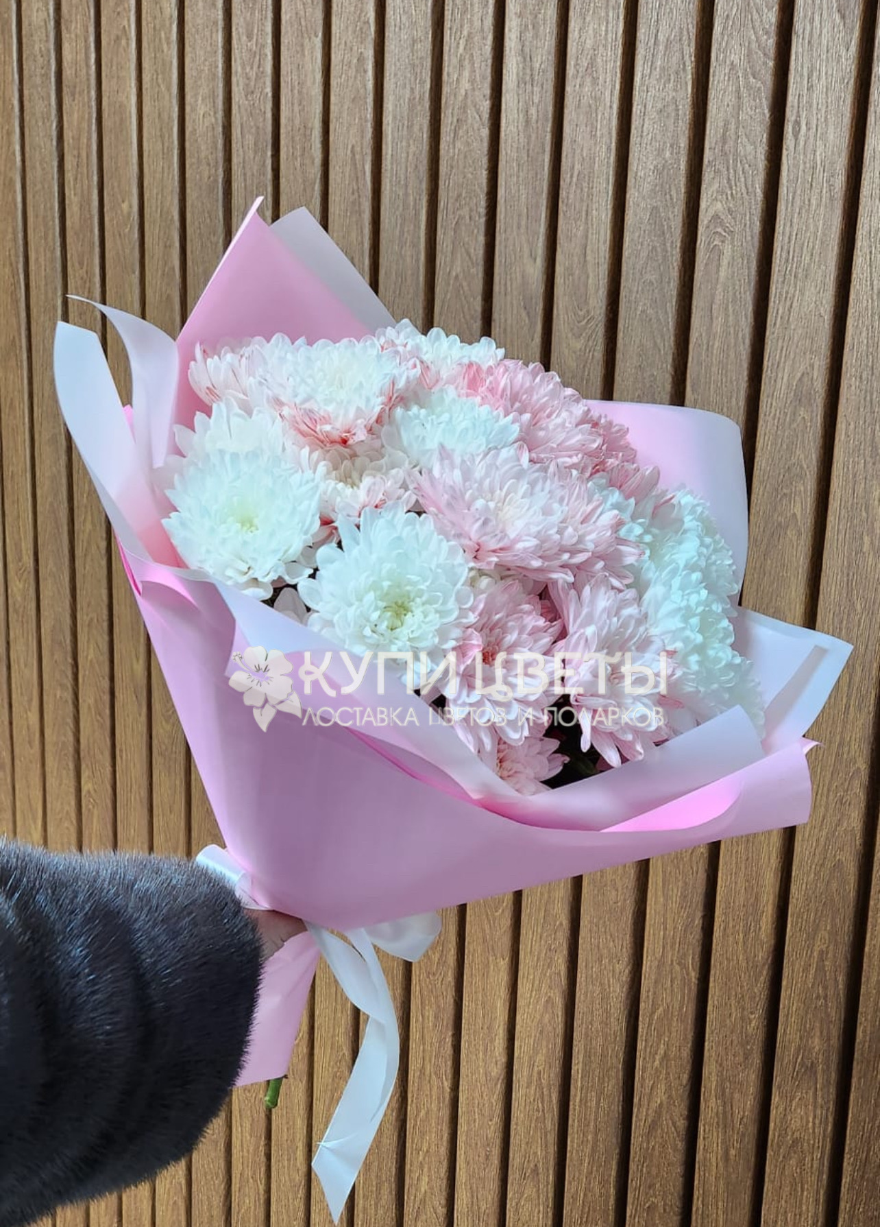 Состав букета: Кустовые хризантемы,упаковка,лента