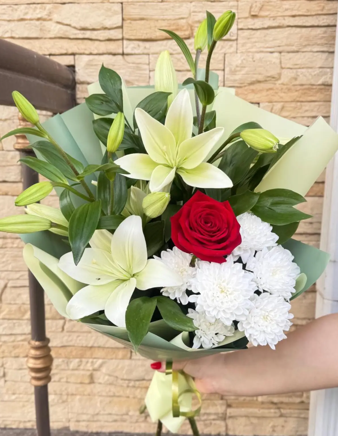 Около розы грациозно располагаются лилии, величественные и элегантные, с их нежным ароматом, способным окутать атмосферу чувственностью и романтикой. Белые хризантемы, словно белоснежные облака, добавляют лёгкости и свежести, дополняя композицию яркими акцентами.