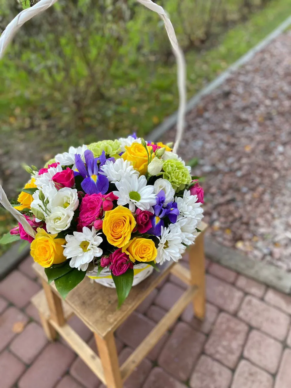 • Стандарт - роза - 7 шт., эустома - 3 шт., хризантема - 3 шт., ирис - 3 шт., гвоздика - 3 шт., салал, оазис, корзина