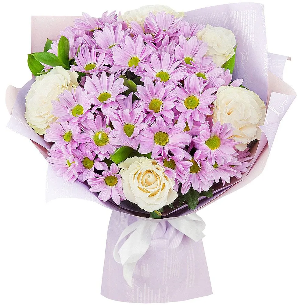 • Стандарт (Кустовая хризантема 4 шт,, роза 5шт, зелень, упаковка, лента)