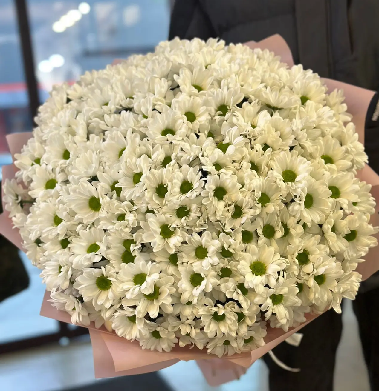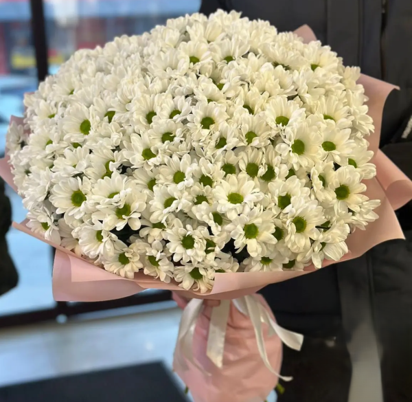 Объёмный и по-настоящему нежный букет из 31 белой ромашковой хризантемы воплощает чистоту, искренность и лёгкость. Пышные соцветия создают эффект воздушного облака, наполняя композицию свежестью и гармонией. Такой букет выглядит одновременно элегантно и трогательно, подчёркивая особое отношение к получателю.