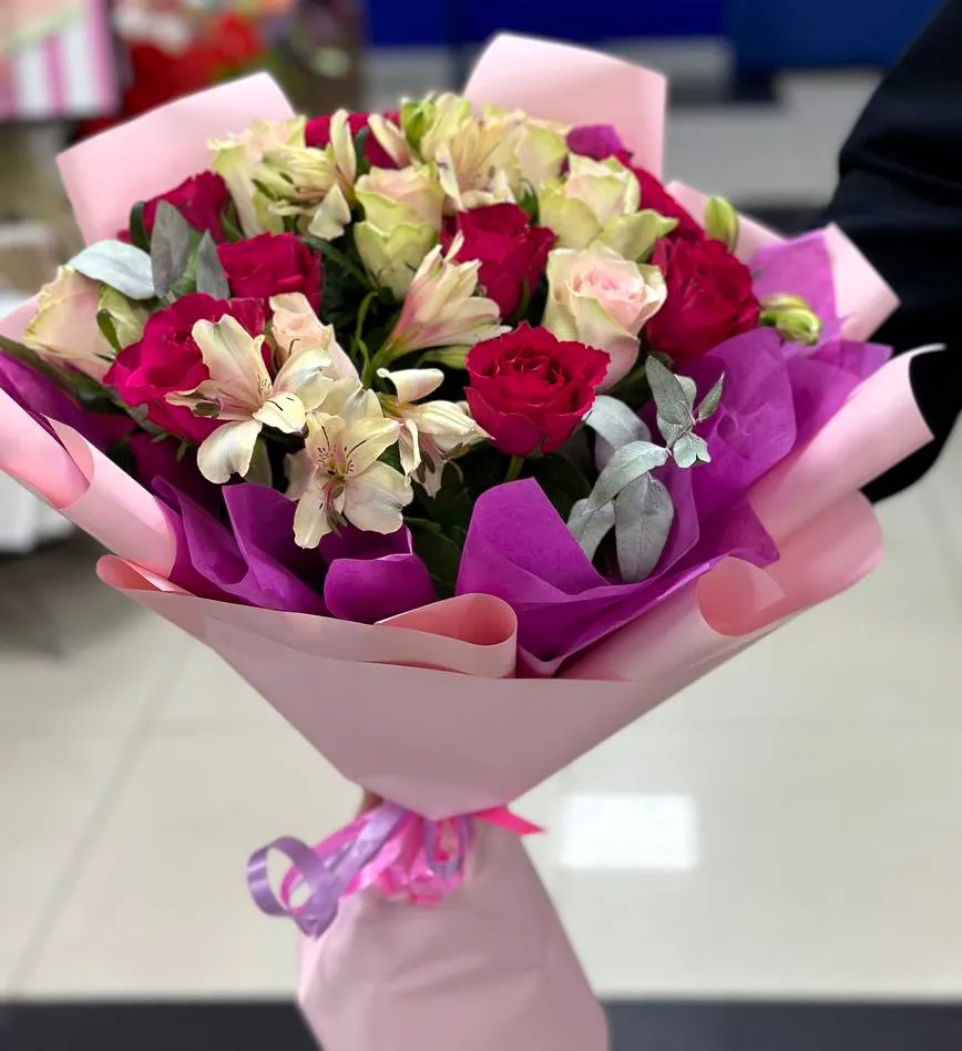 Розы,альстромерии,зелень,упаковка,лента |