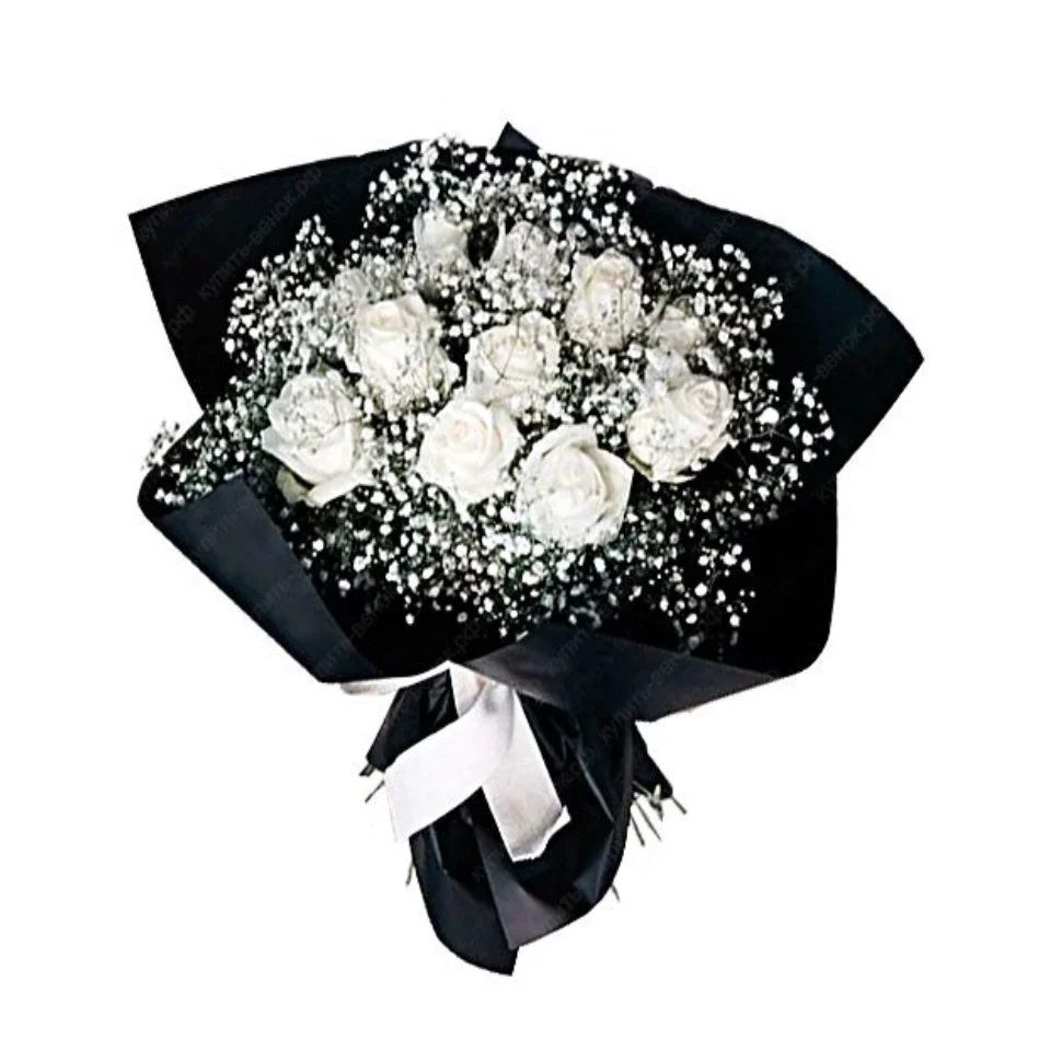 Роза - 10 шт., гипсофила, упаковка, лента |