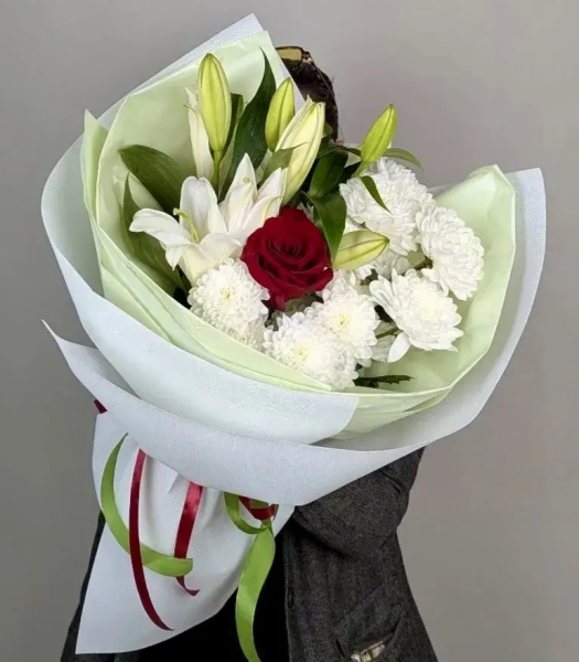 Яркая и гармоничная композиция, в которой изящная лилия, насыщенная красная роза и нежная кустовая хризантема создают выразительный и запоминающийся образ. Букет наполнен контрастом эмоций - от утончённости до страсти, а аккуратная упаковка делает его идеальным подарком для любого повода.
